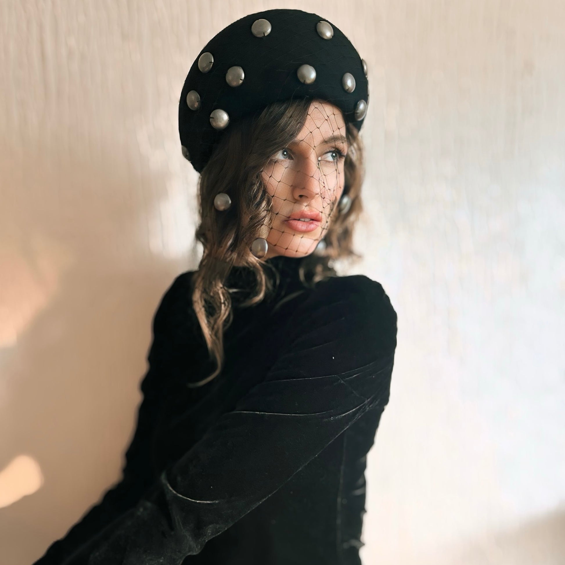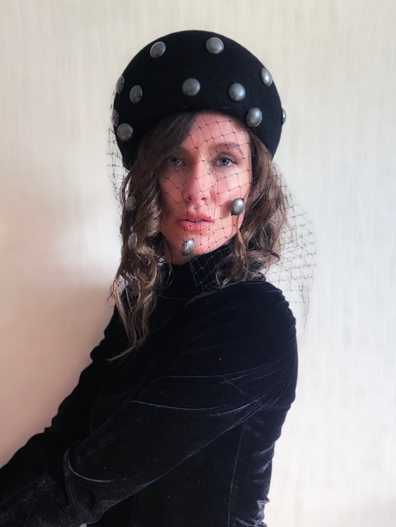 A piece that blends the strength of modern design with the delicacy of handcrafted detail. This pillbox-style beret is made from premium felt and hand-stitched with metallic studs, giving it a bold yet refined character. The delicate veil adds a touch of mystery and timeless elegance, perfectly balancing modernity and femininity.