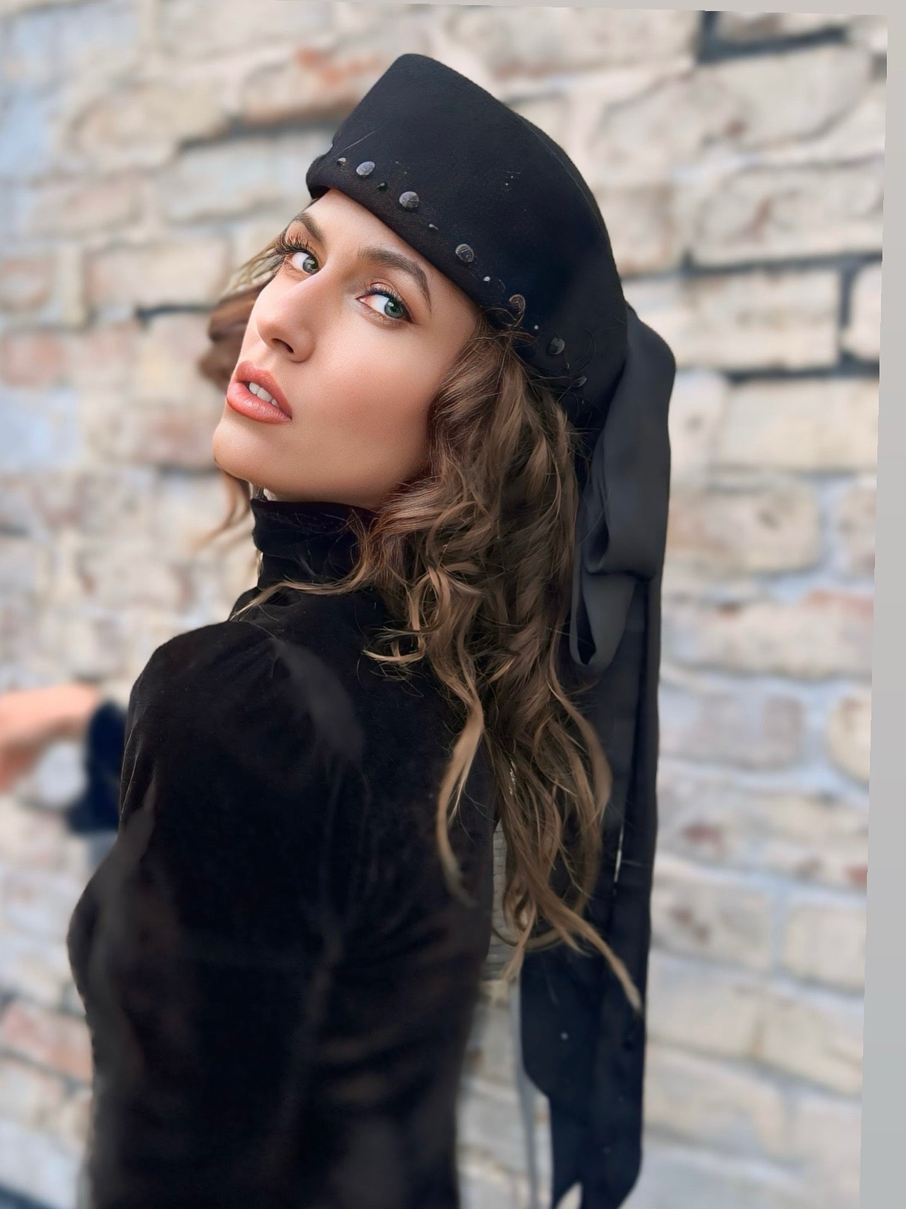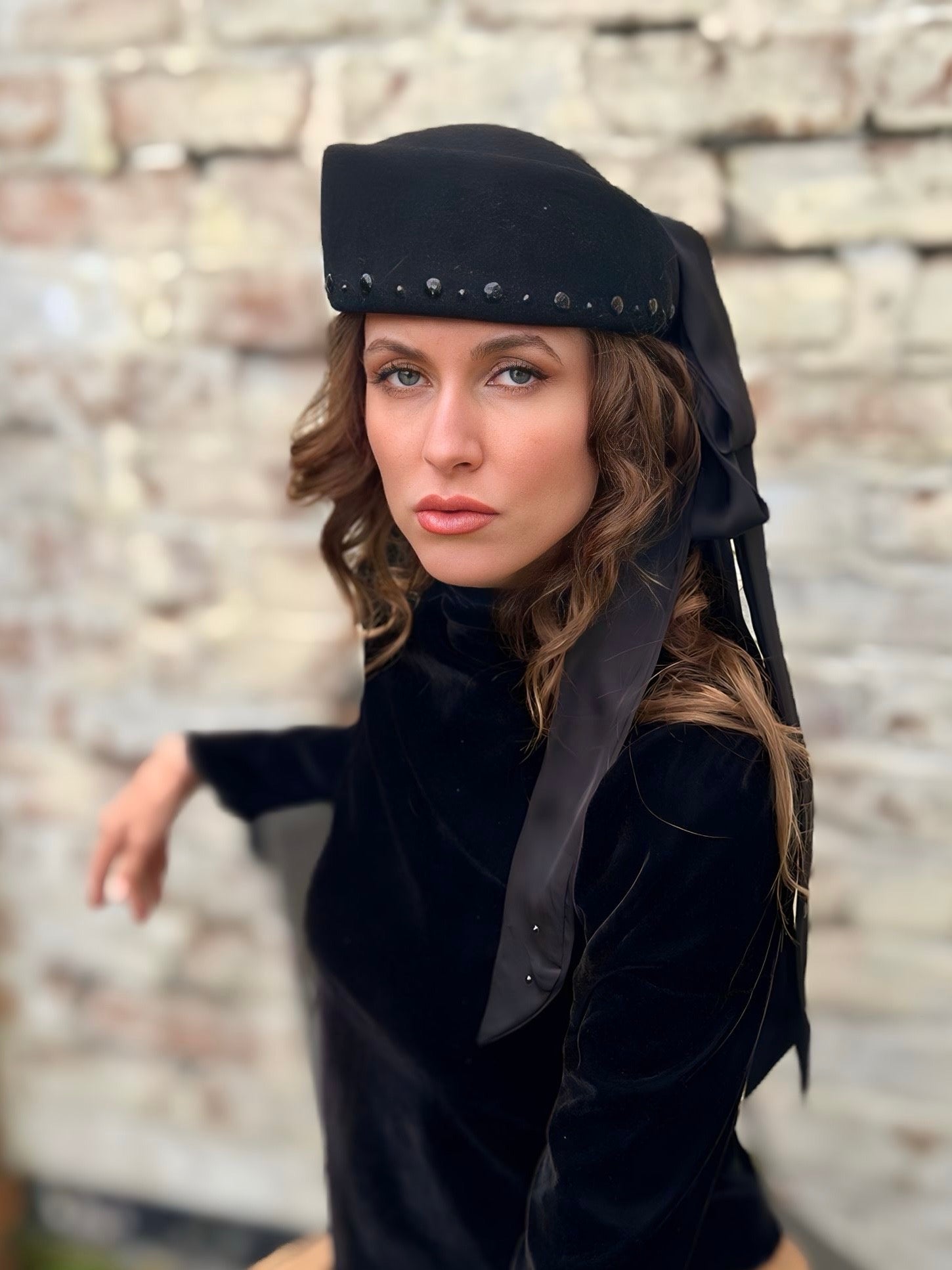 Add a touch of timeless sophistication to your outfit with this elegant black wool beret. Crafted from soft, high-quality wool, it offers both warmth and style. The beret features a delicate row of subtle studs around the edge, adding a modern edge to this classic design. The standout detail is the long black ribbon flowing gracefully at the back, creating a chic and feminine silhouette. Perfect for elevating casual looks or complementing more formal attire, this versatile accessory is a must-have for any fashion lover.