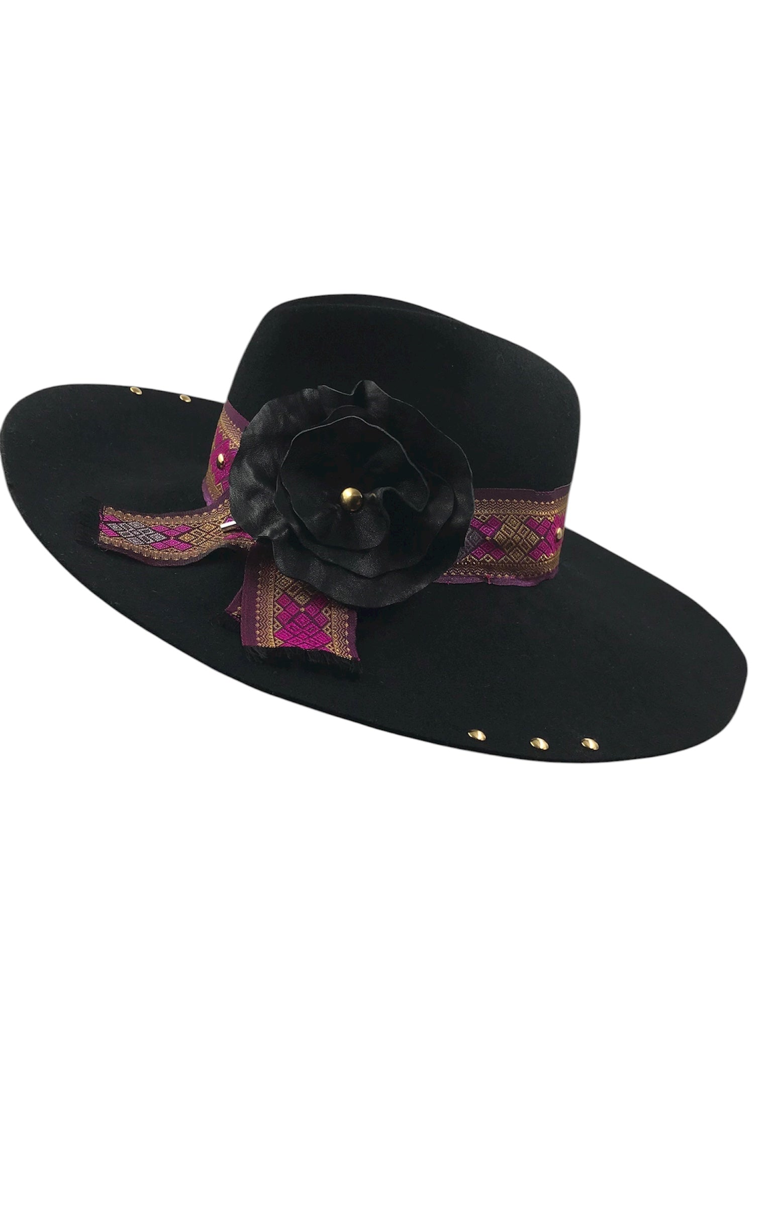 Descubre el encanto único de nuestro sombrero "Gypsy" hecho a mano con fieltro de alta calidad. Su ala ancha y caída ofrece elegancia y estilo para cualquier ocasión. El sombrero incluye una cinta bordada a mano en color fucsia y un pin de flor negra opcional, para que puedas personalizar tu look.